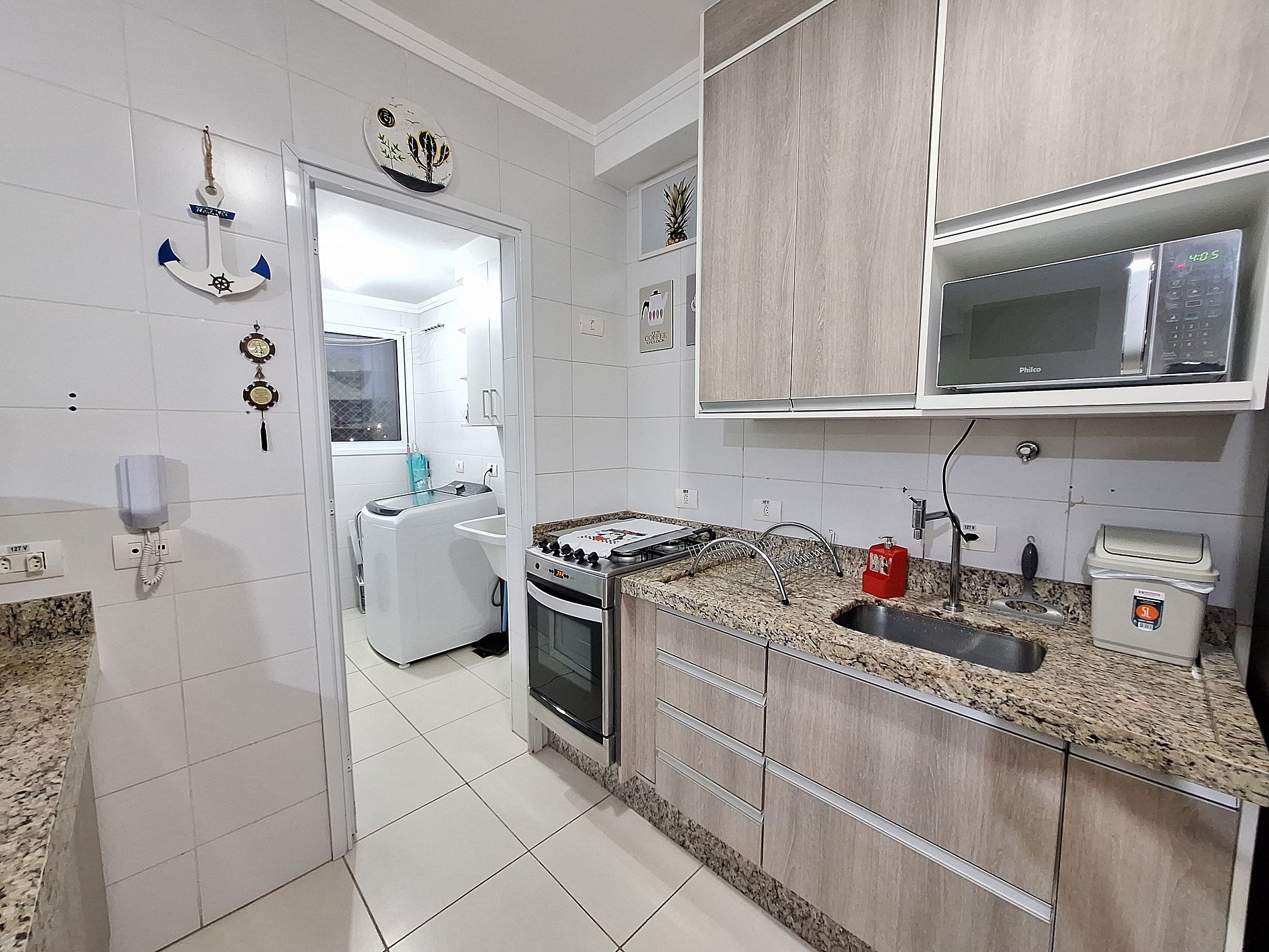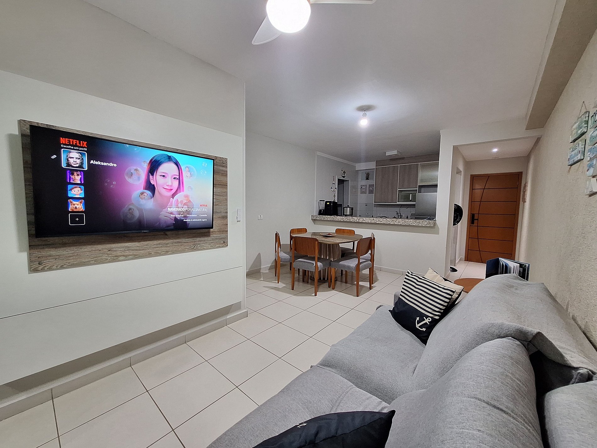 - Sala de estar, de jantar e cozinha completa integradas;